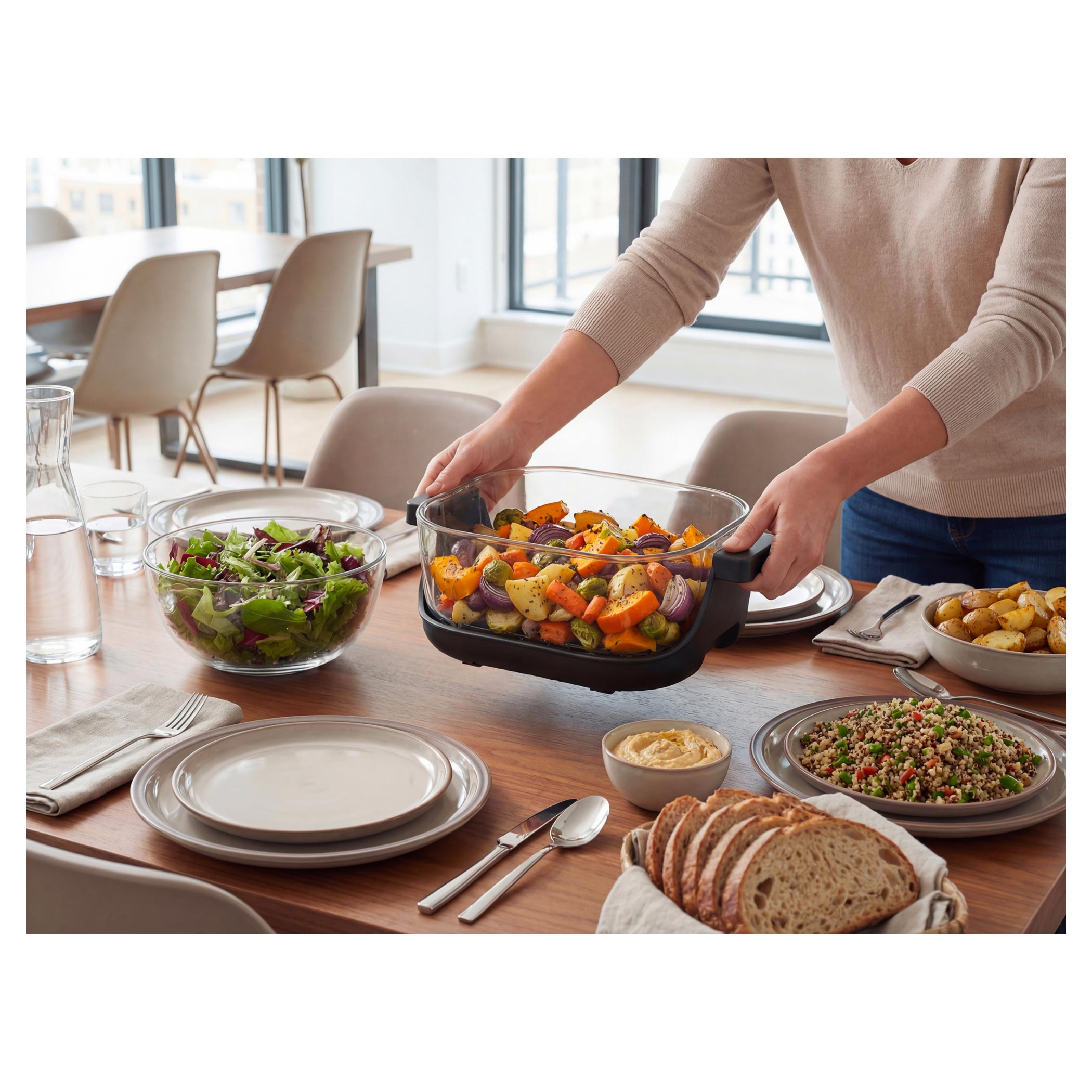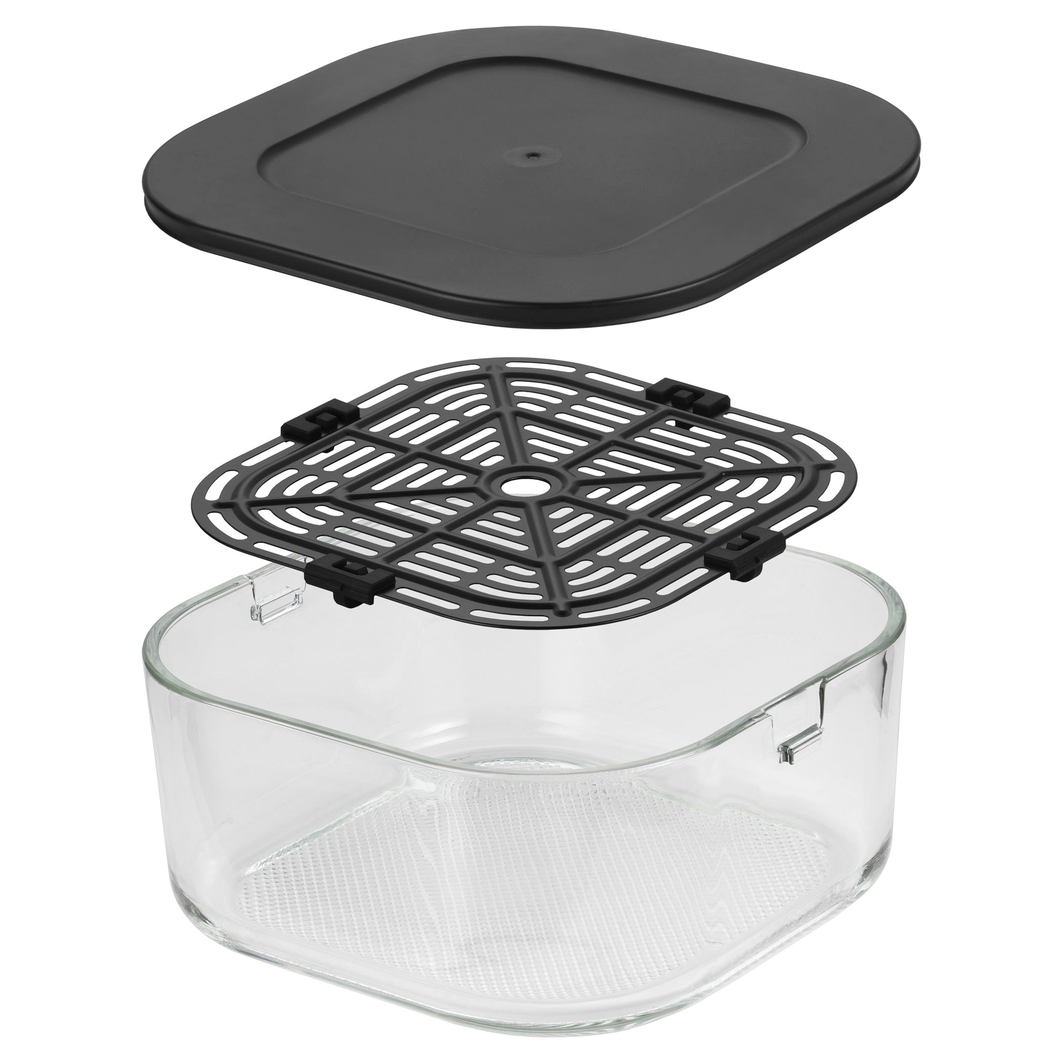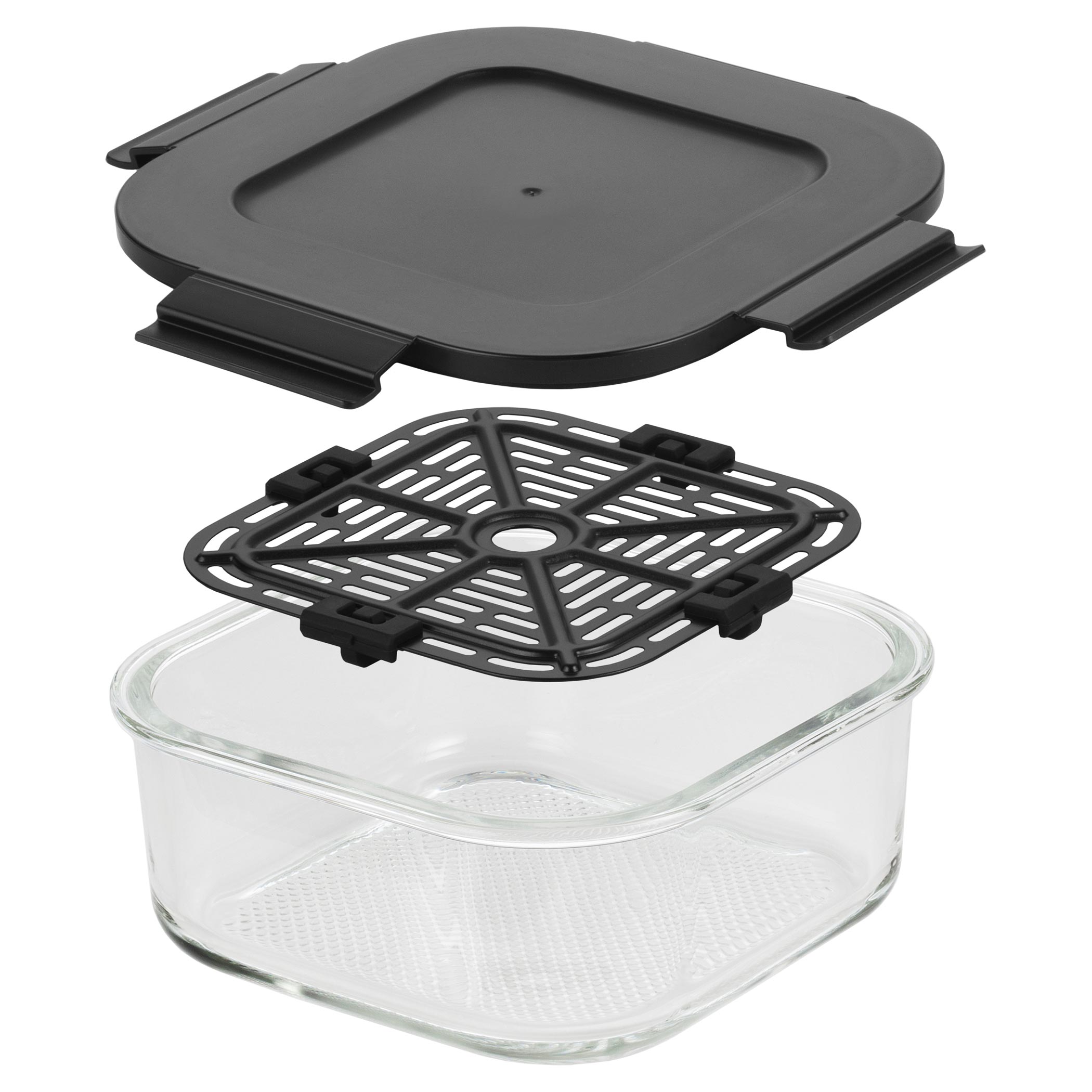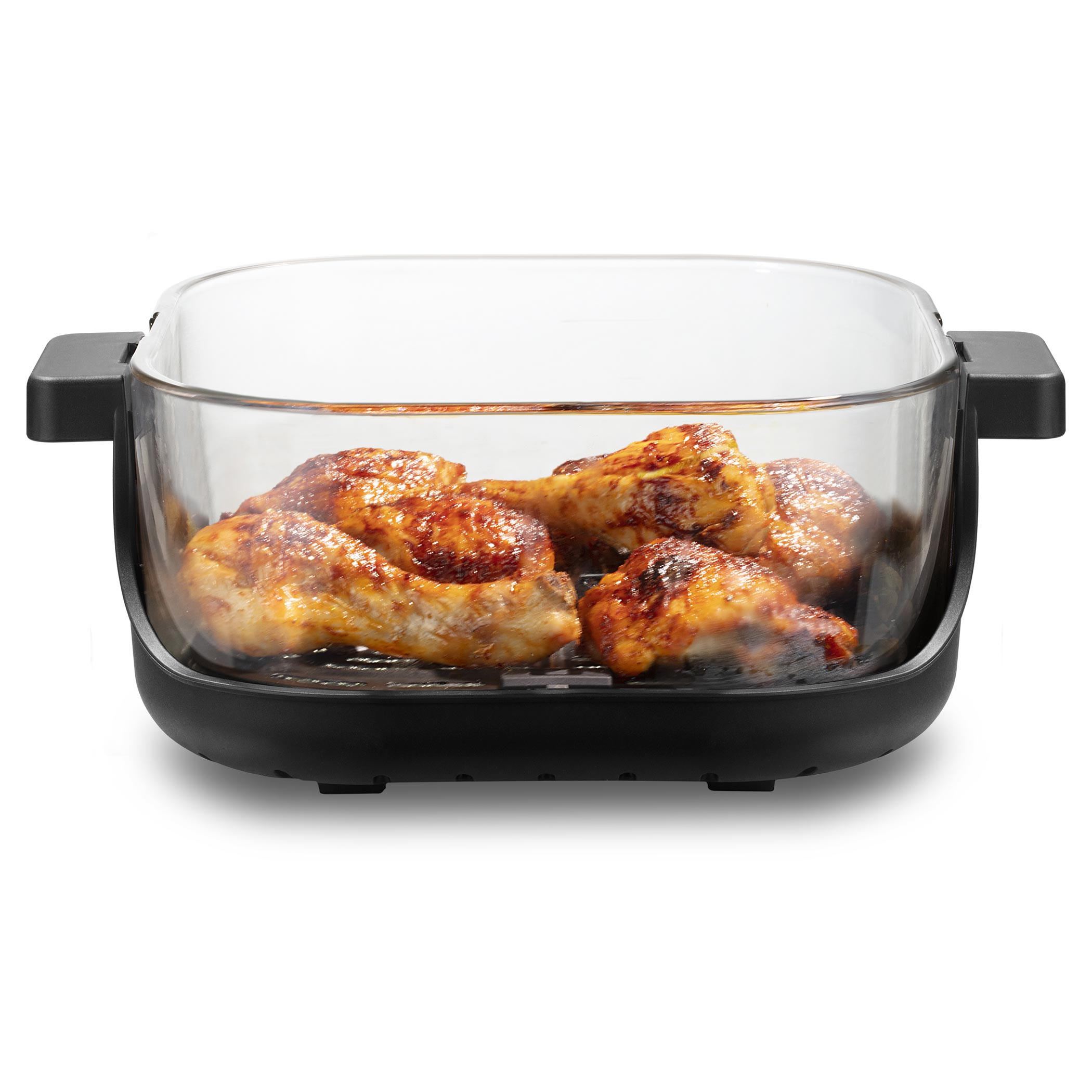 držiak s ušami a hneď po uvarení sa dá rovno použiť ako sklenený pekáč na stôl, z ktorého môžete servírovať. Tiež má viečko, ktorým ju uzavriete, a po vychladnutí uložíte do chladničky alebo vezmete so sebou napríklad do práce. Táto fritéza je navrhnutá tak, že sa celá ohrevná jednotka na jednotlivé nádoby prikladá zhora, taký „tyčiak štýl“. Do nádoby dáte jedlo, na nádobu nasadíte ohrevnú jednotku, na dotykovom displeji nastavíte jeden zo